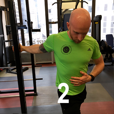 For your upper and mid back, grab ahold of an apparatus so that you arm is extended out in front of you (1) then turn to face your arm and drive your body away from the apparatus (2.) To increase the intensity of the stretch, brace yourself against the apparatus with your other arm and push (3.)